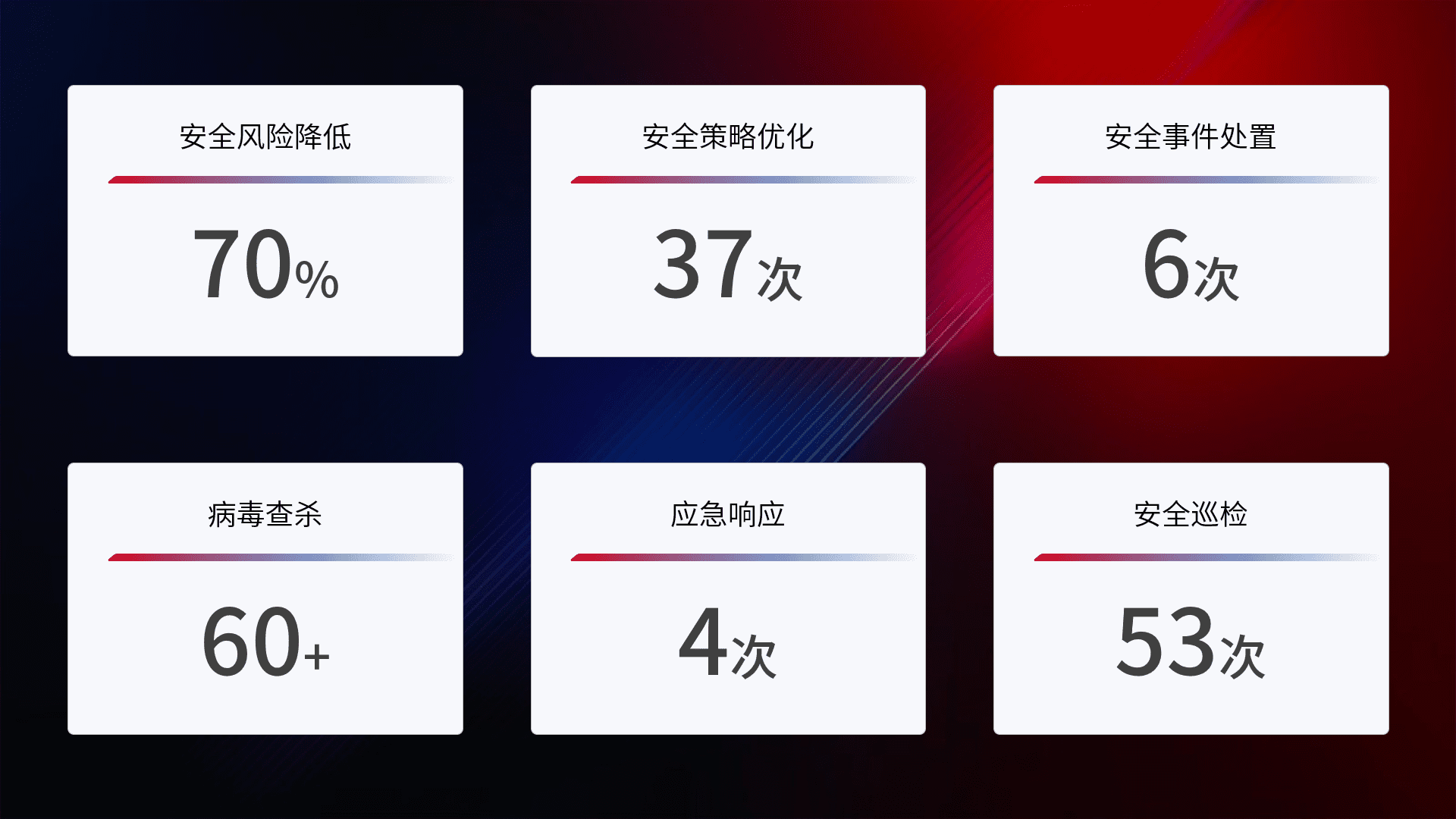 提供全面的安全事件报告体系,,,,包括处置报告、、周报、、、、季度和年度总结,,结合持续监控,,,,帮助客户深入了解网络安全状况。。