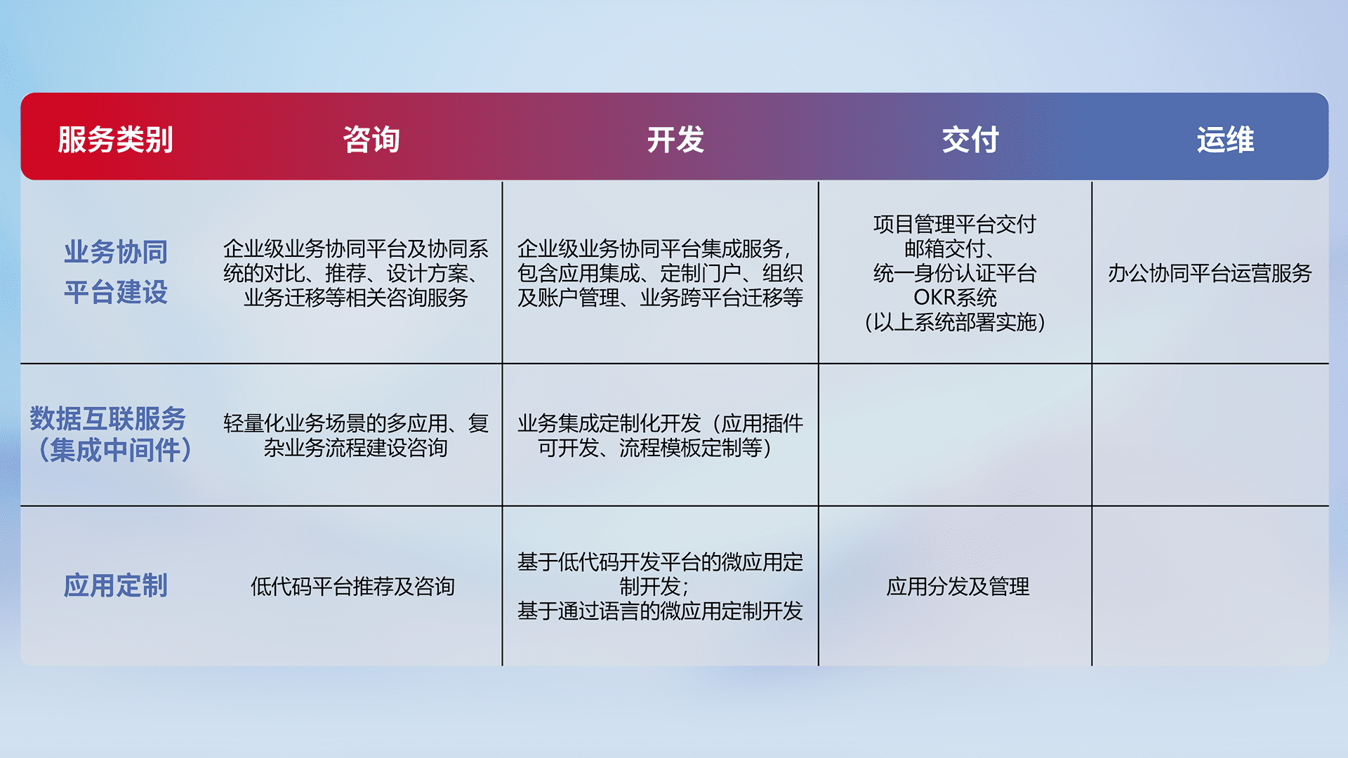 针对钉钉、、、、企微、、IDaas等平台级产品提供产品的规划、、、方案、、交付、、、、定制化开发等服务,,,,实现如统一协同办公、、、智能客户服务、、、、混合会议管理、、、、智能数据查询、、、等业务场景,,实现数字化转型。。。